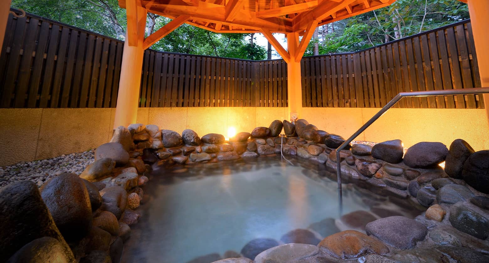 奇跡の美肌温泉をご堪能いただける「岩の湯」・「木の湯」と銘打った2つの貸切露天風呂をご用意いたしました。趣異なる2つの露天風呂にて大切な方と気兼ねの無いプライベートな湯浴みを心ゆくまでお愉しみください。